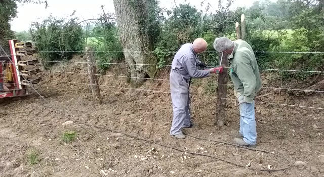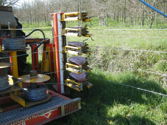 Nous proposons une prestation de location de dérouleuse de barbelés avec un pointeur pneumatique d'agrafes. Nous proposons au choix de l'éleveur de poser de 2 à 5 rangs de barbelés. La vitesse de pose varie de 200 à 500 mètres par heure.